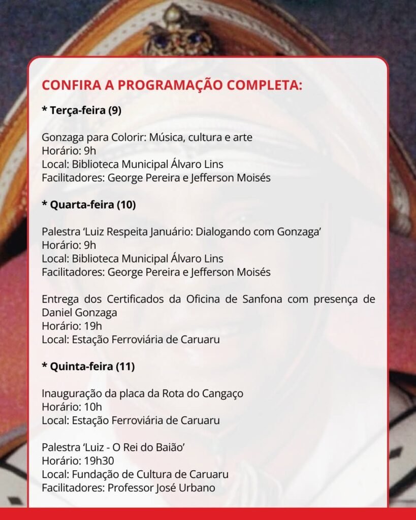 Ao longo da semana, especialistas conduzem debates sobre a obra e o legado de Gonzaga, com temas como “Respeita Januário: Dialogando com Gonzaga”, “Luiz – O Rei do Baião” e “Luiz Gonzaga e a relação com Caruaru”. A programação também contempla o público infantil com a atividade “Gonzaga para Colorir: Música, cultura e arte”, que promove ludicidade aliada à memória do artista.