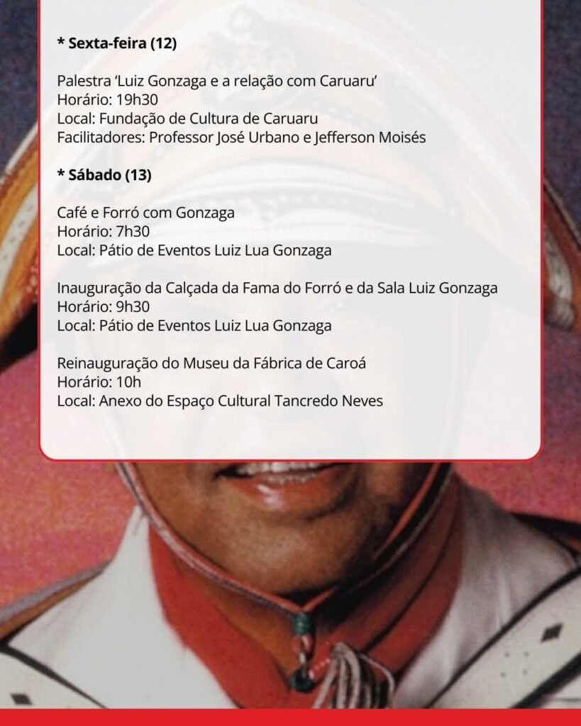 A rede de museus de Caruaru também será ampliada. No sábado, serão abertas a Sala Luiz Gonzaga, nova área do Museu do Forró dedicada ao acervo do artista, e a reinstalação do Museu da Fábrica de Caroá, que passa a contar com melhorias estruturais e novos recursos de acessibilidade.