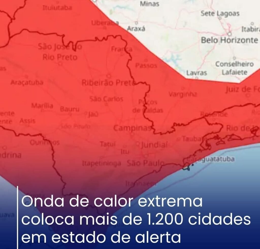 Uma onda de calor considerada de “grande perigo” pelo Inmet (Instituto Nacional de Meteorologia) coloca mais de 1.200 municípios em alerta em três regiões do Brasil.O alerta vermelho atinge cidades de oito estados e segue válido até as 18h da próxima segunda-feira (29). O aviso começou a valer na última terça-feira (23).De acordo com o Inmet, a onda de calor é caracterizada quando as temperaturas ficam 5°C ou mais acima da média por pelo menos cinco dias consecutivos. Entre as áreas afetadas estão Rio de Janeiro e São Paulo, além do norte do Paraná, incluindo Londrina e Curitiba. O aviso também abrange o sul de Minas Gerais, com cidades como Uberaba, Varginha e Juiz de Fora; o leste do Mato Grosso do Sul, incluindo Três Lagoas; e o sul do Espírito Santo, na região de Cachoeiro de Itapemirim.Os últimos dias do ano têm sido marcados por calor intenso em várias partes do país, resultado de um bloqueio atmosférico que atua sobre o Brasil. O fenômeno impede a chegada de sistemas meteorológicos e contribui para a manutenção das altas temperaturas, especialmente na região Sudeste.